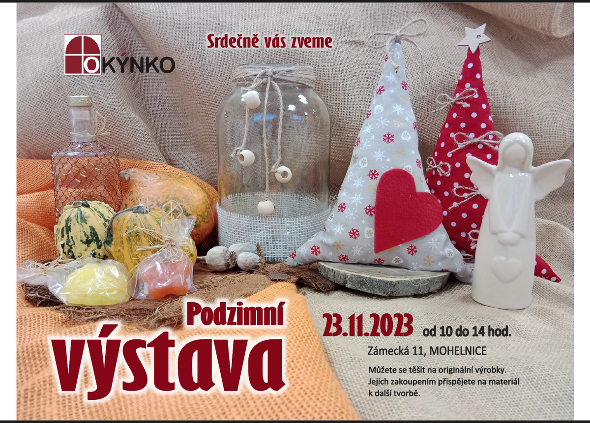 Dvě charitní střediska se v těchto dnech proměňují na výstavní galerie, aby svým návštěvníkům představila to nejlepší, co za poslední dobu vzniklo v jejich ateliérech. Uživatelé a pracovníci vytvořili mnoho krásných výtvarných děl a originálních dekorací, které potěší je i jejich blízké. Přijďte si vychutnat atmosféru podzimu v Mohelnici i blížících se Vánoc v Zábřeze a pořídit dárky. Jejich zakoupením přispějete na další materiál na tvoření. Podzimní výstava - Denní stacionář Okýnko – 23. 11. 2023 od 10 do 14 hod (Mohelnice, Zámecká 11) Vánoční hvězda – Centrum denních služeb OÁZA – 29. 11. 2023 od 9 do 14 hod. (Zábřeh, Žižkova 15)